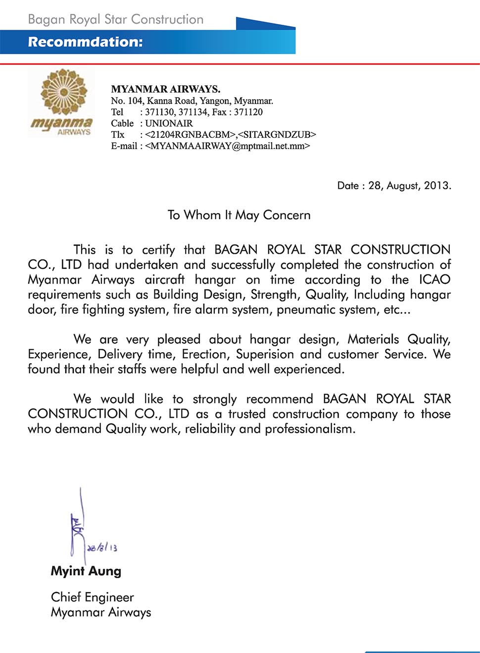 Bagan Royal Star Construction Co., Ltd was founded in 1996, registered in accordance with the Ministry of National Planning and Economic Development, Investment and Administrator for Companies Development to enable construction works. Company Reg: No 462/2008-2009 legally registered for inland/oversea orders for building of Godowns/ Warehouses/ Aircraft Hangers/ Offices/ Staff Apartments etc. We utilize specially Imported Steel Materials, Local Manufactured Steel Materials and concrete work in flooring. We employ highly experienced, competent, qualified engineers and skillful workers in our construction works. We achieved the 100% satisfaction of our customer.